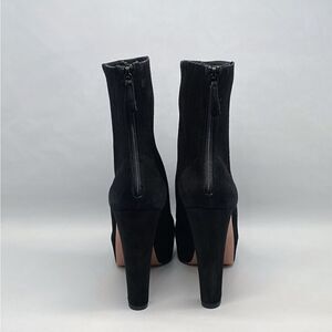 Elevated with a block heel and platform, these round-toe booties are finished in luxurious suede.