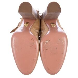 Camel suede Aquazzura ankle boots with semi-round toes, fringe accents at top lines, braided leather bow accents at counters featuring tassel detailing, stacked block heels and zip closures at sides. Size 39.