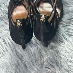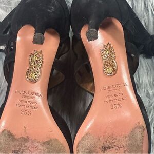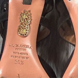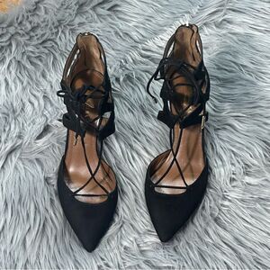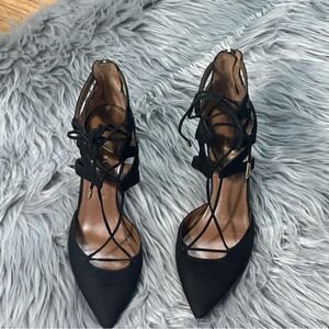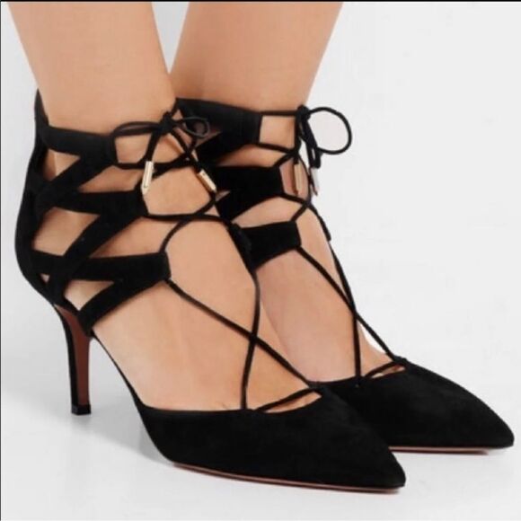 These Aquazzura heels feature a sleek black suede design with a pointed toe and a stylish lace-up detail that ties above the ankle. The stiletto heel adds height and elegance, making them perfect for a sophisticated look.