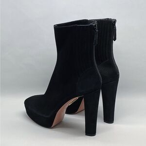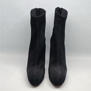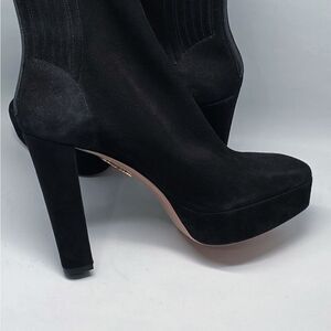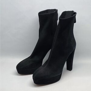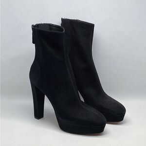 Elevated with a block heel and platform, these round-toe booties are finished in luxurious suede.