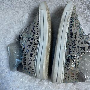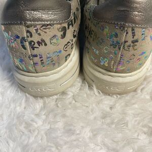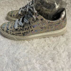 Ara women’s court yard sneakers gray with metallic graffiti style letters size 9 .Pre owned in good used condition signs of wear on the outer soles.