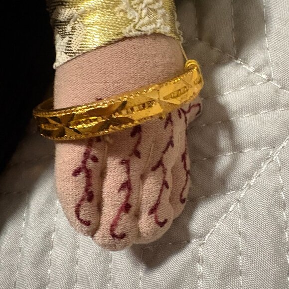 Hand made by professional artist Sharon Jamon in Kuwait to look like authentic Gulf Arabs in their formal traditional dress. The female has “gold” bangles/necklace/earrings/hairpiece, henna on hands, kaftan and robe to finish off the outfit. Male has dishdasha and robe, full headpiece, prayer beads. 21” tall