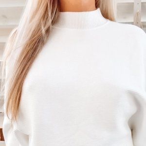 Our Arabella Mock Neck Sweater is just as soft as it is glamorous. Featured in a frosty shade of white in a ribbed and insanely soft fabrication, with a mock neckline and long dolman sleeves. We love it with our Sarah striped joggers for a more casual look as well.