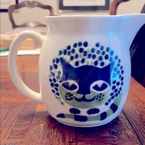 Delightful ceramic pitcher with a whimsical cat illustration. Features bold blue and green hues. Ideal for serving or display.