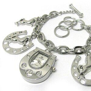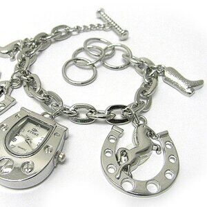 This beautiful crystal embedded charm bracelet features a boot, Arabian Horse, horseshoe, and horseshoe clock charm which needs a new battery. Bracelets measures 7-9" on the ring and toggle choices.