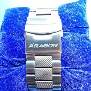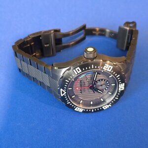 Aragon Enforcer Watch. NE57 automatic movement. Gunmetal grey 50mm case and matching bracelet. Grey dial with red and blue highlights. Power reserve indicator and date sub dial. Watch has been worn but is in excellent condition. Comes in original box with papers. GB39