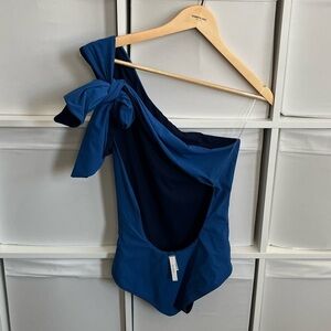 A chic single shoulder maillot featuring versatile wide ties that can be knotted or made into a bow at back.