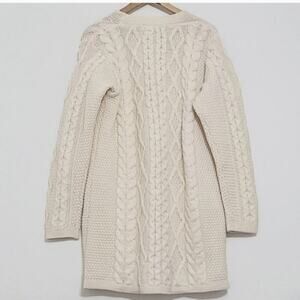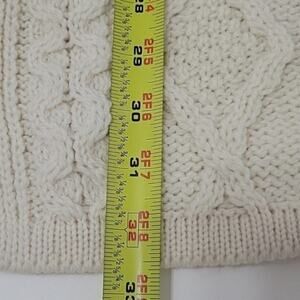 This article worn several times. merino wool fabric. buttons for closure. cozy and warm. chunky. color is like ivory. long sleeve. v neckline. good quality.