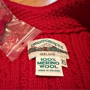 Aran Crafts Ireland 100% Merino Wool long button down cardigan sweater, women’s size XS. Red Chunky cable knit/fishermans. New without tags. No flaws. Made in Ireland. Please see photos for item details/dimensions. Some photos may appear different in color due to lighting. Ships from smoke-free home.