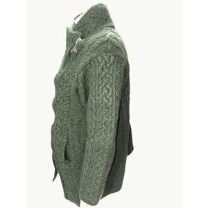 Aran Crafts Ireland XL Green Merino Wool Cable Knit Funnel Neck Cardigan Sweater