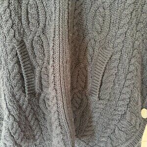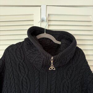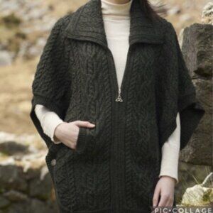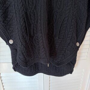 Aran Crafts women's oversized cardigan sweater jacket, size XL. High collar can be worn up or down. Full zip in front with Celtic detail at zip pull. Black. 100% merino wool. Poncho style, open at sides except for single button closure on each side above the hem. Front pockets. Made in Ireland. Dry clean.