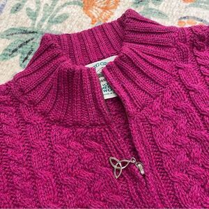 Features: zipper front, long sleeves, front pockets, Celtic knot cable-knit pattern