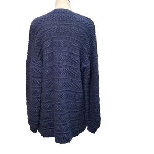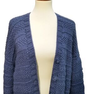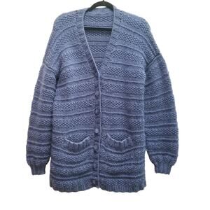 Aran Style Women's Long Blue Cardigan Sweater Wool Chunky Knit Pockets Fits Size L (No Tags)