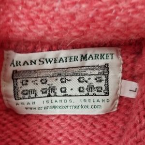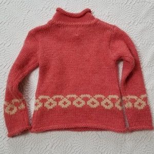 Toddler Aran Sweater Market, Aran Islands, Ireland pink Lambswool Sweater. It's unusual plain Knit salmon pink with white robe design on sleeves and bottom.