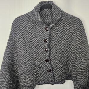 The Aran Sweater Market Herringbone Gray Merino Wool Crop Poncho Sweater is a stylish and versatile piece made in Ireland. Crafted from a wool blend with a chunky-knit herringbone pattern, this sleeveless poncho features a collared neckline and kimono sleeves for a trendy look. Perfect for various occasions such as travel, parties, casual outings, work, and business, this oversized sweater offers a relaxed fit and comes in a timeless blue color. To care for this piece, it is recommended to dry clean only, ensuring its longevity and maintaining its quality. Ideal for the winter, fall, and spring seasons, this retro-inspired cape sweater is a must-have for any woman's wardrobe.