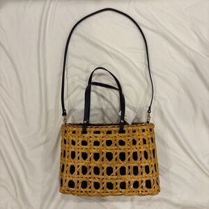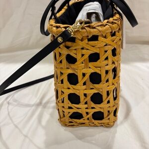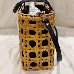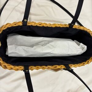 Roomy, handcrafted bag from the Philippines, perfect for summer. Drawstring closure with a black tassel on either side of a black fabric interior for a dramatic and polished look.