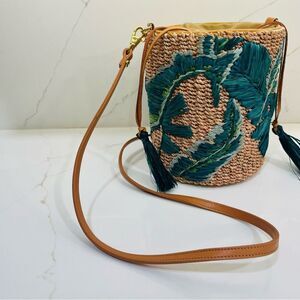Elevate your style with this tropical woven bucket bag. Featuring a stunning teal and tan design, it's perfect for adding a vibrant touch to any outfit.