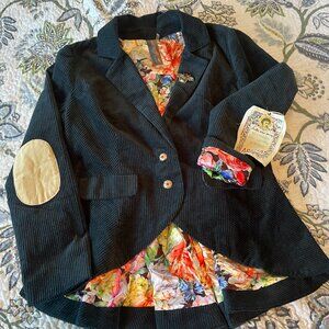 Aratta Carol Corduroy button-up blazer with fitted waist, 2 front flap pockets, removable crystal brooch on the lapel, crystal buttons, velvet elbow patches, high-low hem, floral print satin lining.
