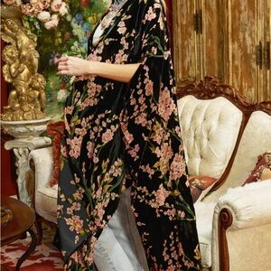 Elegant floral kimono. Features a black base with pink floral patterns. Perfect for layering.