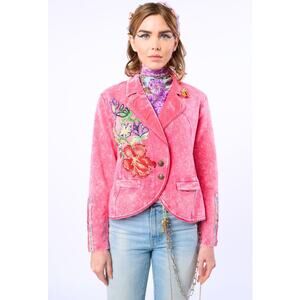Washed French terry button-up blazer, velvet collar/lapel, right front with sequin embroidered patch, floral jacquard trim sewn on sleeves, queen bee brooch attached to collar, 2 front flap pockets, metallic buttons sewn on sleeves & center front, blazer not lined