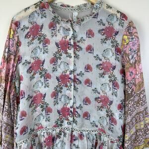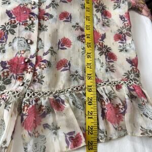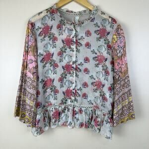 Blouse from the brand Aratta Silent Journey, in a boho/romantic style. Features ruffles on the hem and collar, flared sleeves, delicate floral print, and lightweight, flowing fabric for movement.