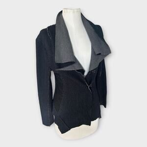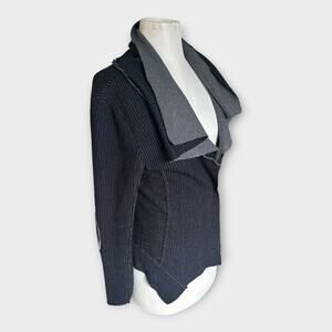 Women's Aratta Silent Journey Drapey Asymmetrical hem wrap cardigan in a soft sweatshirt type material with velvet elbow patches. Women's size small. This cardigan is in excellent preowned condition but is missing on hook on the front. It functions well with only the bottom on and would be a very easy fix.