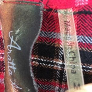 •Red, black, and gray plaid flannel front.