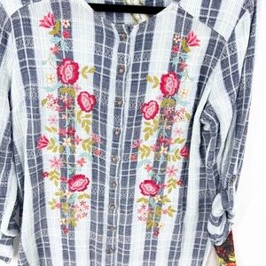 Aratta Silent Journey Plaid Embroidered Floral Button Up Tunic Small. EUC