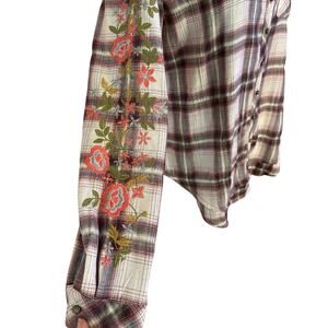 Aratta Silent Journey Plaid Nature Shirt. Plaid flannel. Nature scene in back. Floral embroidery on the sleeves. Button up. Size Small. Preowned, no flaws.