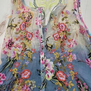 Stunning Aratta Silent Journey tunic overlay! Heavily embroidered with floral detailing and a lace up back. Sheer fit, size medium.