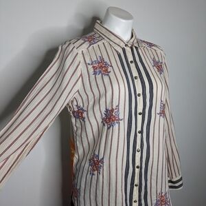 Aratta Silent Journey white orange mixed print long sleeve button up shirt M. Embroidered floral front & shoulders, floral panel back. One small snag at the bottom (see photo).