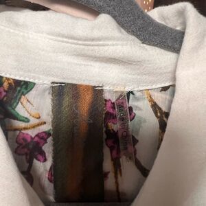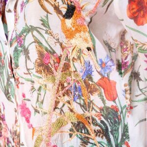 Floral print long sleeve button-up shirt with embellished embroidered birds and flowers on front, high-low hem
