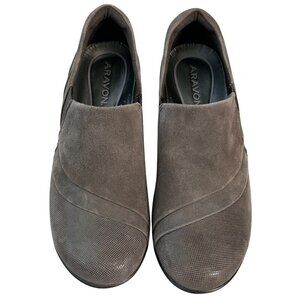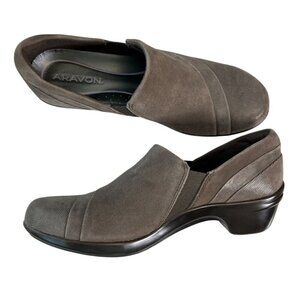 Aravon shoes, women's slip-ons, comfort footwear, suede mesh shoes, professional shoes, cushioned footbed, gray shoes, office wear, casual shoes, breathable design, low heel shoes, easy wear, durable sole