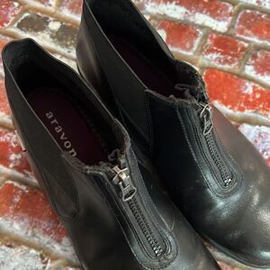Aravon black leather ankle boots with front zipper they’re high-quality leather waterproof good used condition no damage