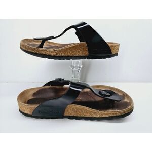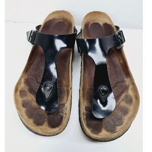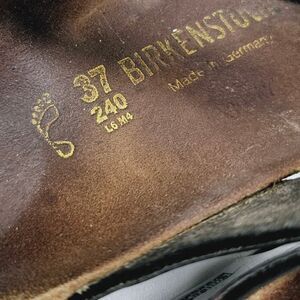Birkenstock side have some wear where bends. Details can also been seen in picture. Size is Women 6 in black color.
