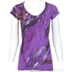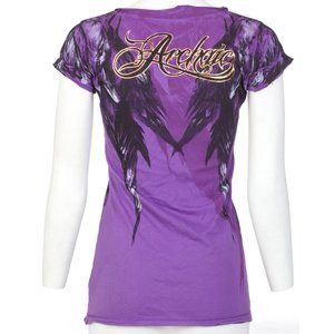 Archaic AFFLICTION Women's T-Shirt SECOND LOVE Feathers PURPLE Tattoo Biker $40
