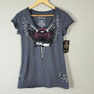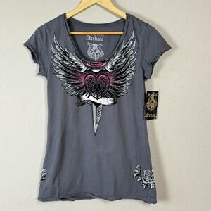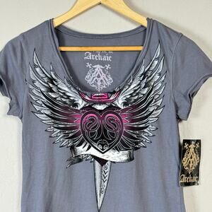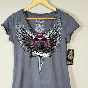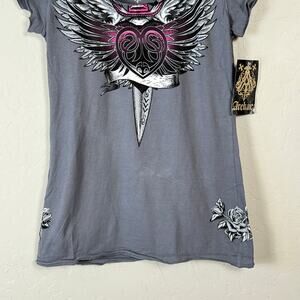 Stylish gray blouse with bold graphic design. Features pink accents and intricate details. Perfect for casual wear.