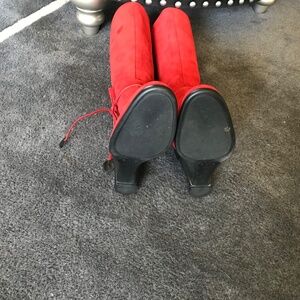 Red Suede outer shell, boot length in all is 17 1/2" with a 3" heel, width at top is 4 1/2"