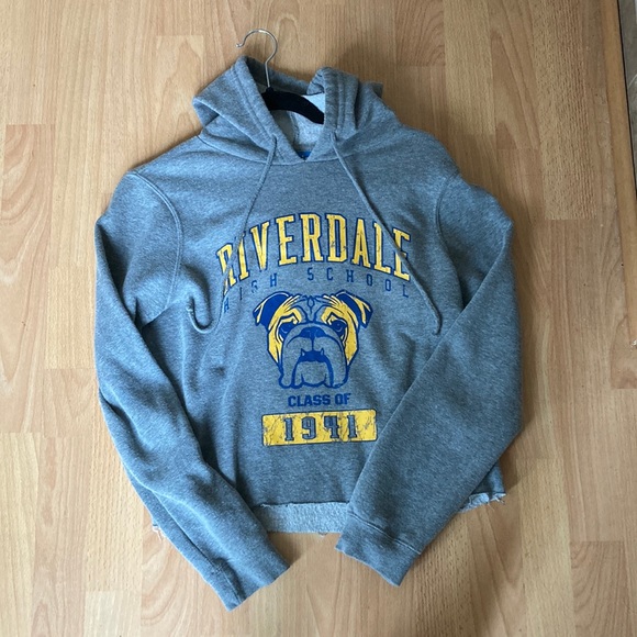 It’s a size medium. Never worn. Gray, yellow, blue. Cropped sweatshirt. River-dale merch.