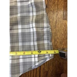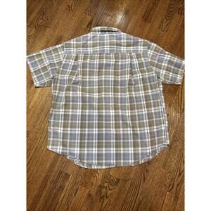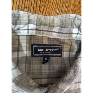 Men’s Architect plaid short sleeve button up in XL—earth-tone brown/tan/gray check, lightweight woven fabric, classic button-down collar and clean casual style. Easy everyday shirt for work, weekend, travel, and warm weather; pairs with jeans, chinos, or shorts. Fresh look, ready to wear; see measurements below.