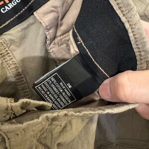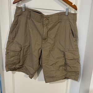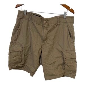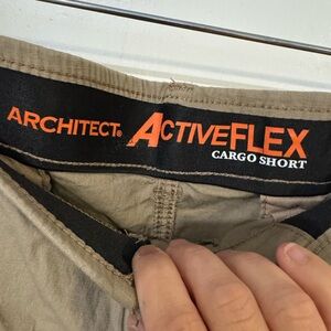 These tan cargo shorts by Architect offer a comfortable fit and a classic cargo style, perfect for casual outings. Made from a durable material, they feature a knee-length design with a standard waistband and belt loops for added convenience. Bin 4 item 29.