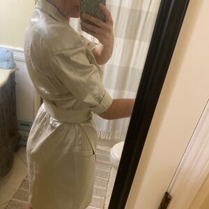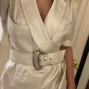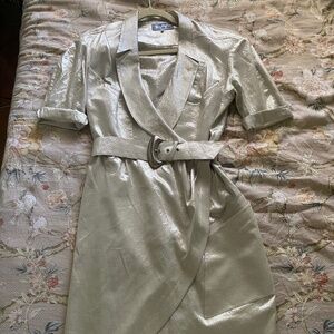 Futuristic Thierry Mugler archival haute couture piece. Gorgeous silver fabric and cinched waist. Mugler signature shoulder pads for that high 80s look.