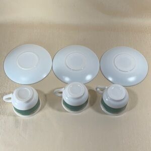 Set of three teacups with matching saucers. Features a striking green and tan design.