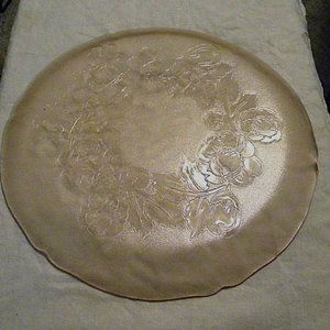 12 ½ inch diameter pink glass serving platter with the Summer Roses pattern. The plate is marked on the bottom with the words Arcoroc France. Color -- Pink Size -- 12 ½ inch diameter
