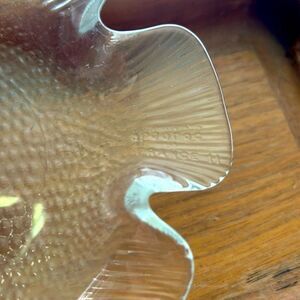 Vintage Arcoroc Poisson Fish Bread and Butter or Seafood Sushi Appetizer Plates Clear Glass Serving Set of 4. Textured glass plate with pressed fish design throughout the plate. This Arcoroc clear glass plate has scalloped edges. Made of fully tempered glass for added strenght and durability. Pressed into the plate at the tail is the name Arcoroc France.