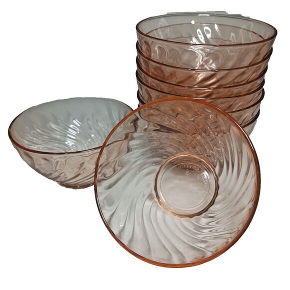 Arcoroc France Rosaline Set of 8 Pink Swirl Glass Dessert Bowls 4.75 In. Vintage