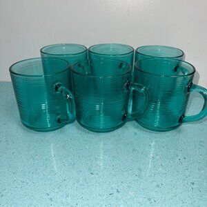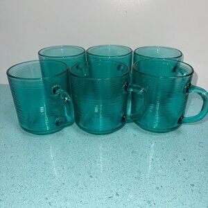 Arcoroc Vintage Mugs Jardiniere Teal Glass Ribbed Tea Coffee Set Of 6 France
