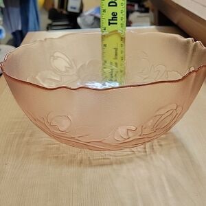 Add a touch of vintage elegance to your home decor with this beautiful Arcoroc France Rosaline pattern pink glass bowl. The round shape and flower theme make it perfect for serving salad or as a decorative piece in your dining room. 9" rpund. Made of high-quality glass, this bowl is a vintage collectible from France, with a unique and charming design that will impress your guests. The Arcoroc Rosaline bowl is a must-have for glassware enthusiasts and collectors. It is an ideal addition to your decorative cookware, dinnerware, and serveware collection. The vintage style and pink color make it an eye-catching piece that will enhance the look of any table. This bowl is a true gem from the past that will add a touch of nostalgia to your home.