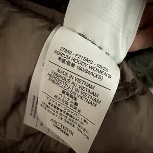 Arc'teryx Agrium Hoody Down Puffer Jacket in Green. Size womens XS. Features dope dyed outer material with fluorine free water repellency, long sleeve, elastic cuffs, adjustable hem with a drawstring, fixed hood, full zip closure, front pockets, high neck, quilted, packable, lined, goose down insulated, logo on the left chest. 100% nylon. Discoloration near neck.