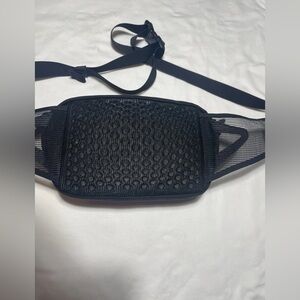 Compact black crossbody bag with adjustable strap. Front zipper pocket and mesh sides. Ideal for travel and daily use.